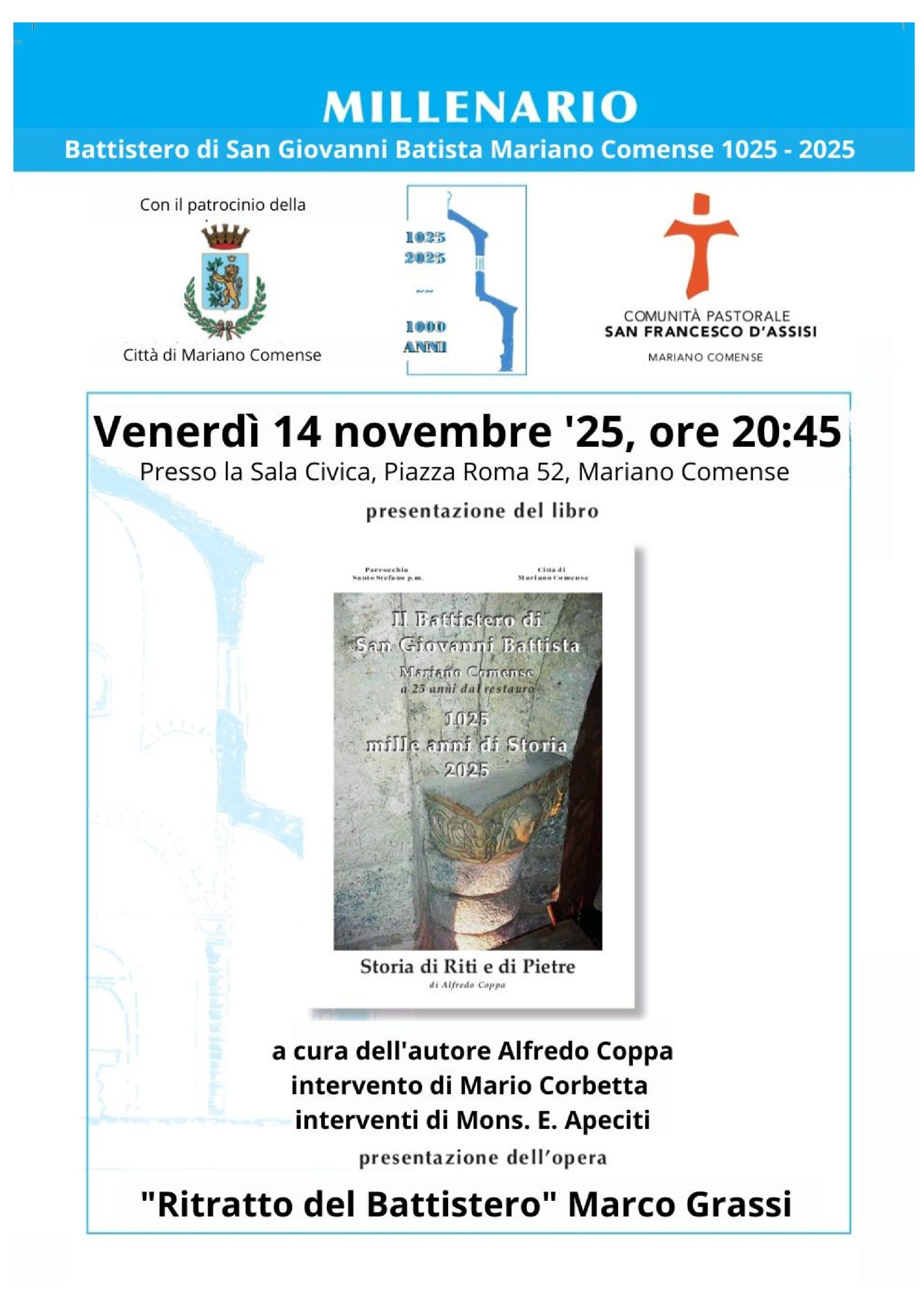 presentazione libro “Il battistero di San Giovanni Battista. Mariano Comense 1025-2025 Storia di riti e di pietre” a cura dell’autore A. Coppa.